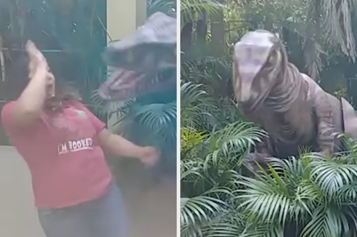 This Mom Getting Scared By A Dinosaur During A Photo Is Unbelievably Extra